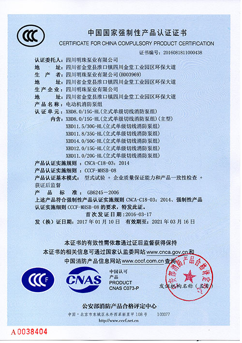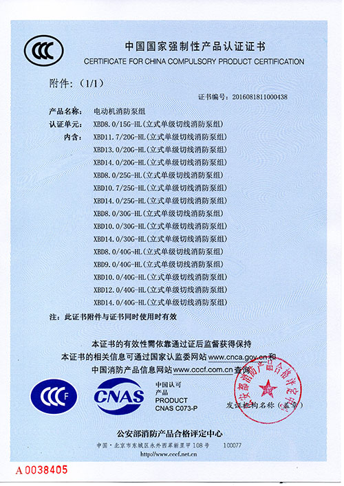 恭賀我司新增HL立式多級切線(xiàn)消防泵組系列CCCF證書(shū)