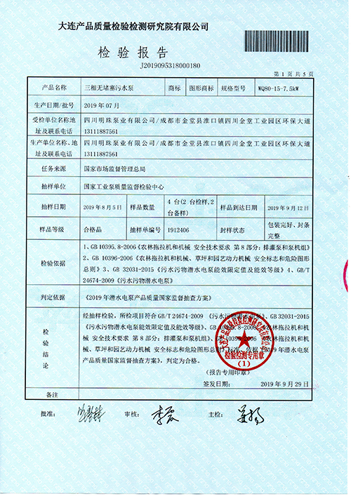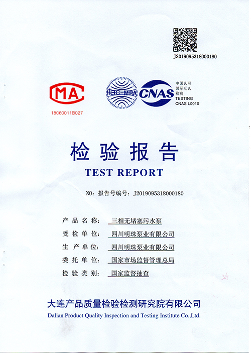 我司泵產(chǎn)品通過(guò)國家監督抽查質(zhì)量檢驗檢測研究院——檢驗報告!