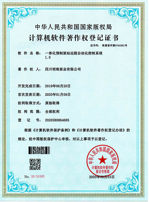 恭賀我司“一體化預制泵站遠程自動(dòng)化控制系統”榮獲國家版權局《計算機軟件著(zhù)作權登記證書(shū)》
